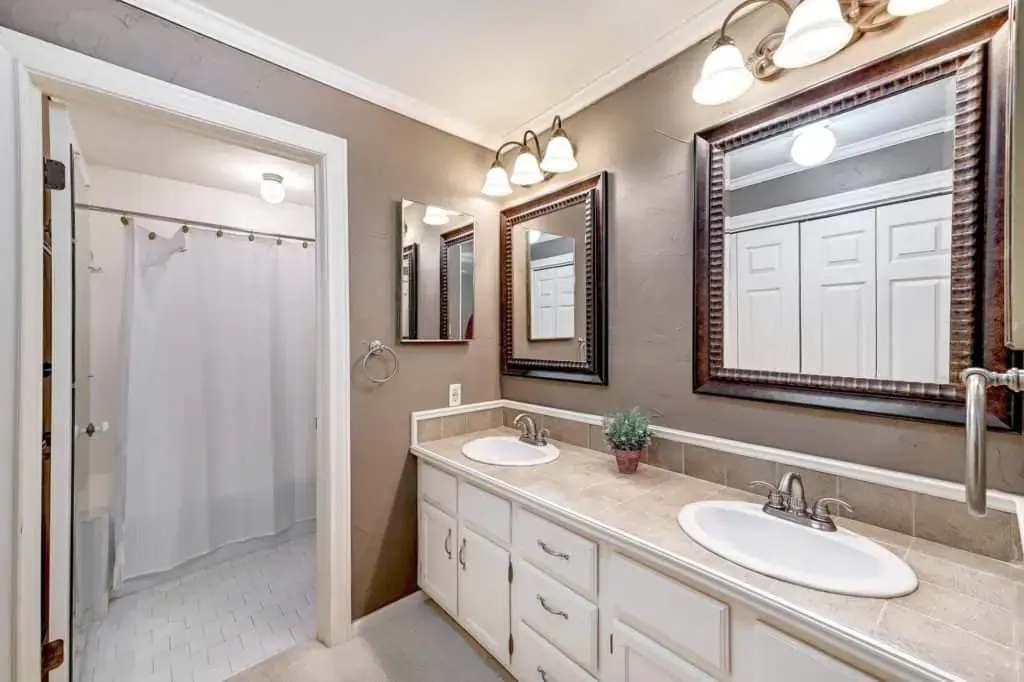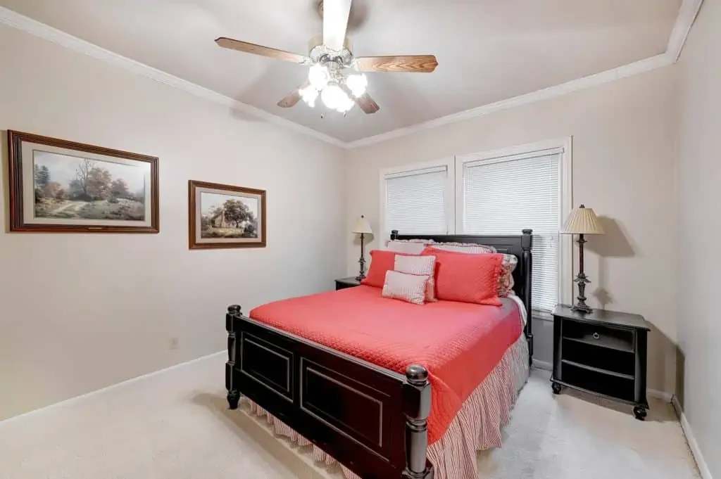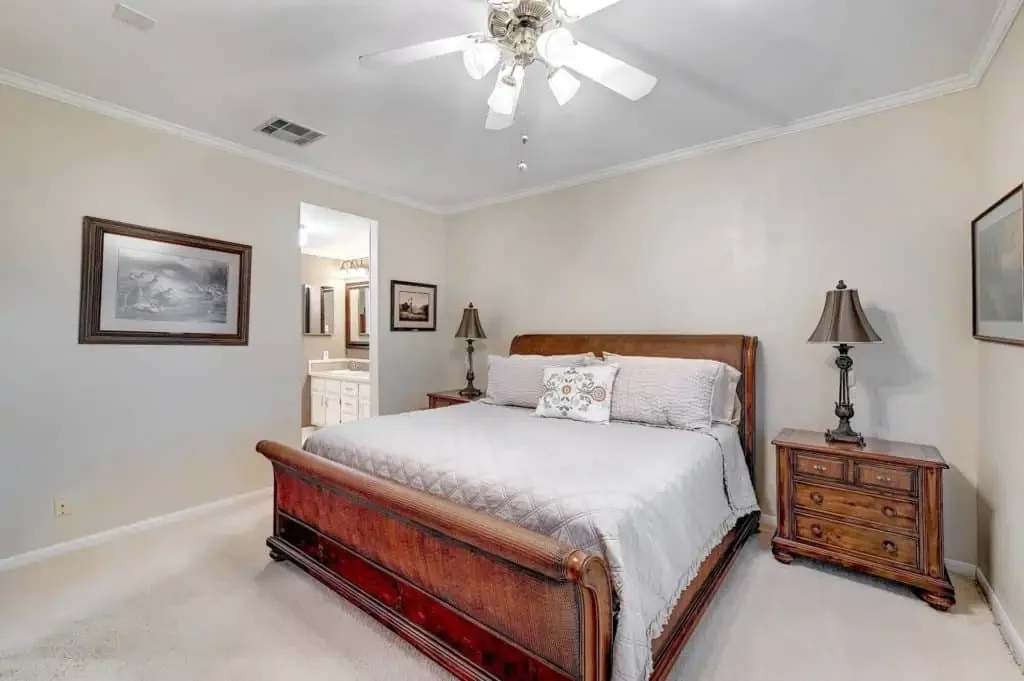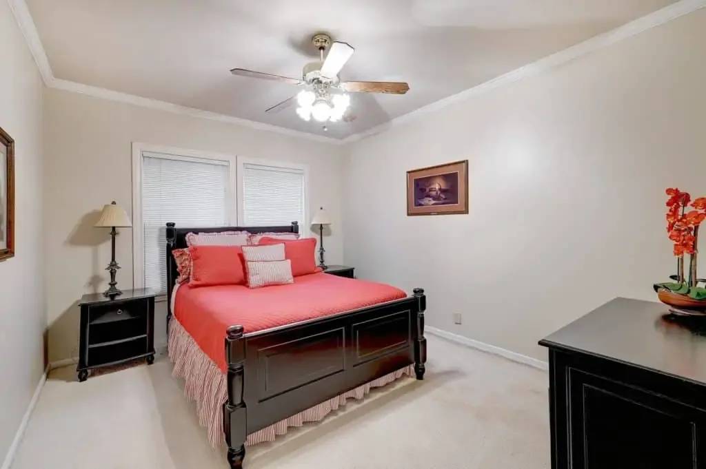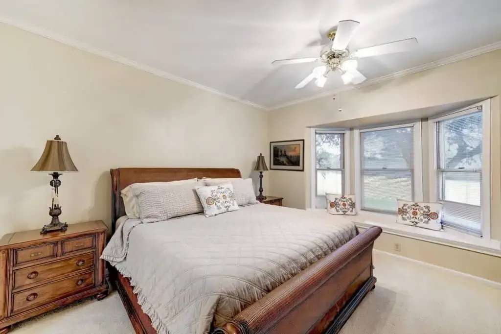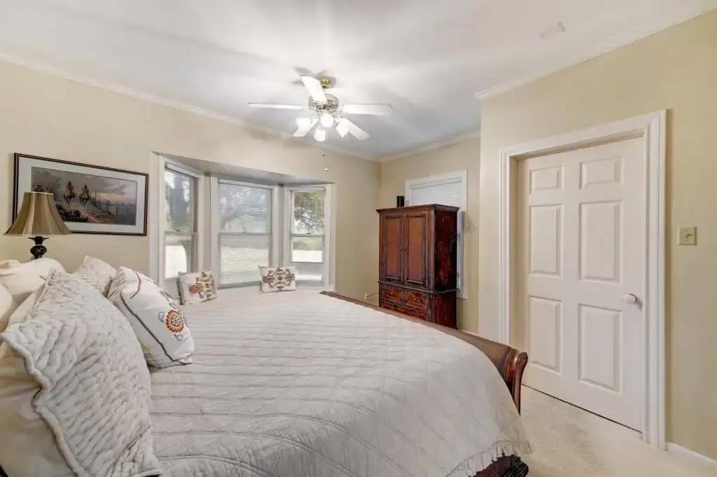 The master suite is spacious with bay window seating to cozy up with a book and a view. The master suite also has a walk-in closet and a dual vanity. This split floor-plan also has a guest bedroom with a walk-in closet.