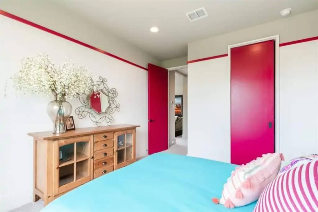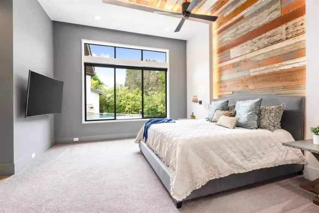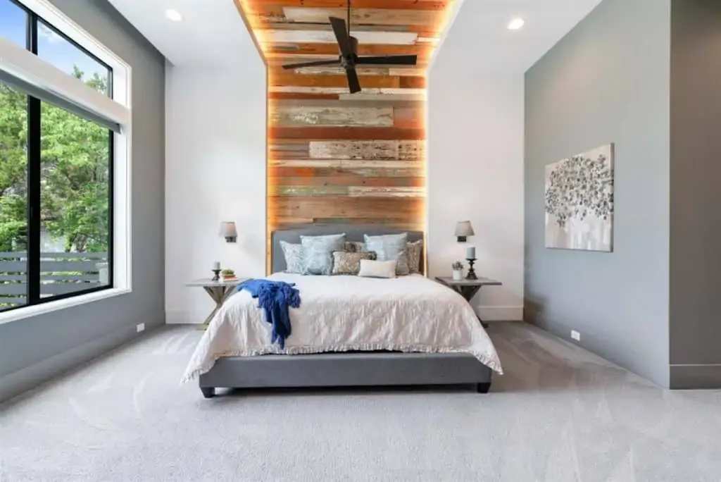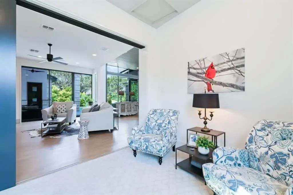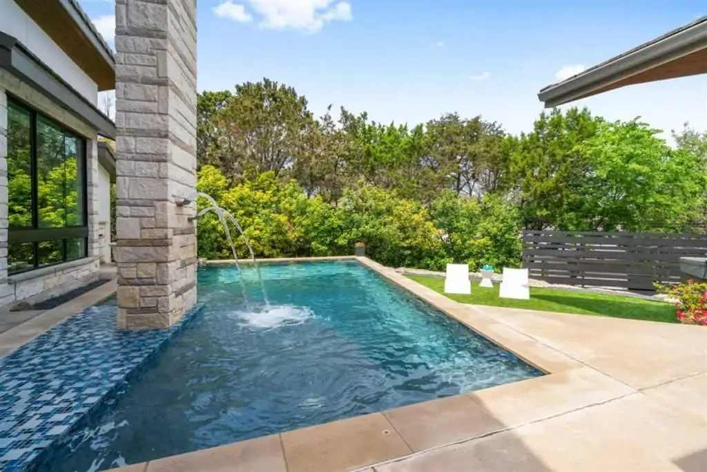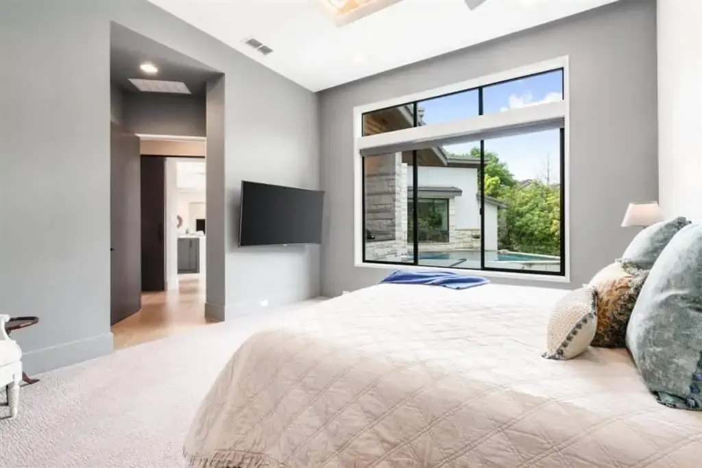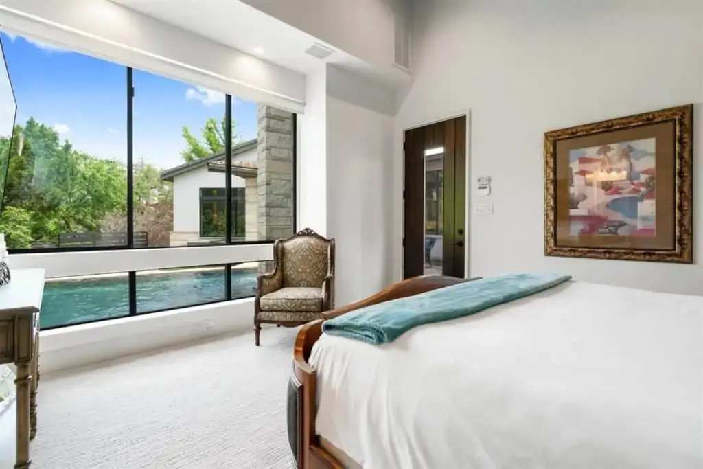 Retreat to the private master suite/ wing with floor-to-ceiling windows and a view to your beautiful pool. Notice the reclaimed wood inlay from Johnson City behind the master bed. Relax in an oversized tub and a separate dual shower head walk-in shower. The master closet is a fashion lover ‘s dream with pocket doors, high ceilings, spacious enough for a sitting area, and custom built-ins. The master bedroom itself is voluminous and has gorgeous windows that allow for both seclusion and tranquility.